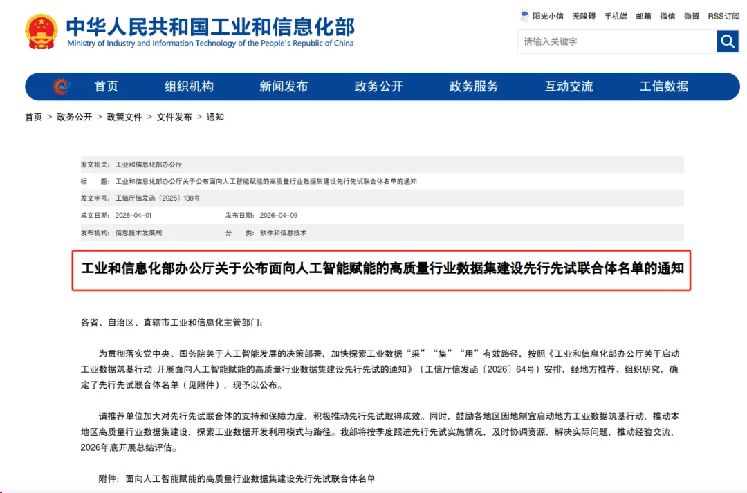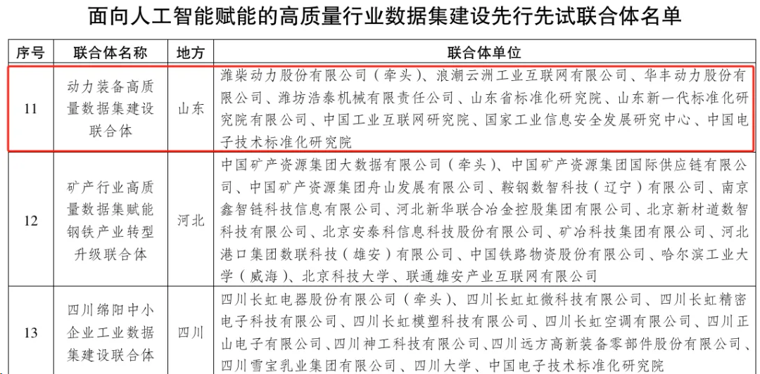 今日,工业和信息化部办公厅正式发布《关于公布面向人工智能赋能的高质量行业数据集建设先行先试联合体名单的通知》(工信厅信发函〔2026〕138号)。由我市潍柴动力股份有限公司牵头的动力装备高质量数据集建设联合体,成功入选国家首批先行先试名单,全省首例,标志着潍坊在服务国家人工智能赋能新型工业化战略中,迈出了坚实且关键的一步。